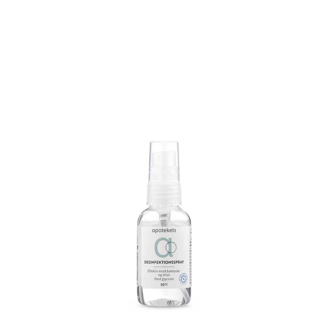 Apotekets desinficerende spray til hænderne sikrer optimal håndhygiejne, når der er langt til vand og sæbe. Sprayen indeholder glycerin, så huden på hænderne ikke tørrer ud. Den er uden parfume, hudvenlig og efterlader huden bakteriefri.