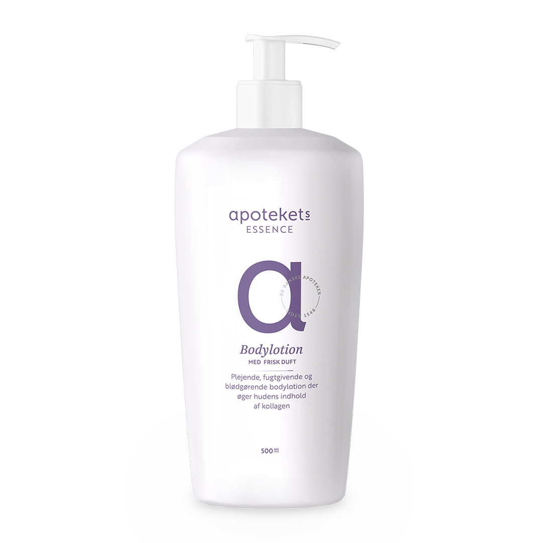 Kan anvendes dagligt til hele kroppen, gerne lige efter badet. Til badet anbefaler vi Apotekets Essence Bodyshampoo 500 ml med duft.
