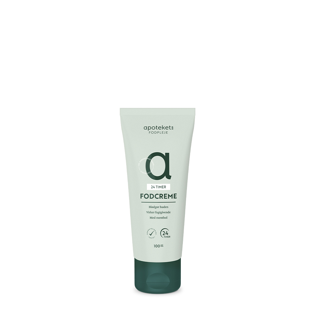 Apotekets Fodcreme 24 Timer er en fugtgivende og blødgørende fodcreme med bl.a. shea butter og panthenol til daglig pleje af tørre fødder.