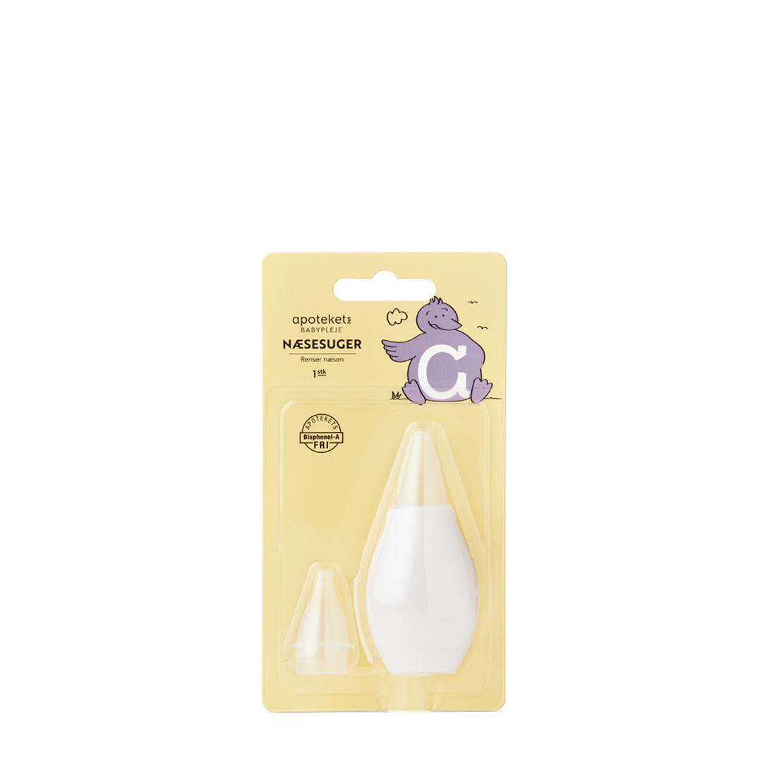 Apotekets Næsesuger renser blidt og nemt babys næsebor for slim, så barnet lettere kan trække vejret gennem næsen.