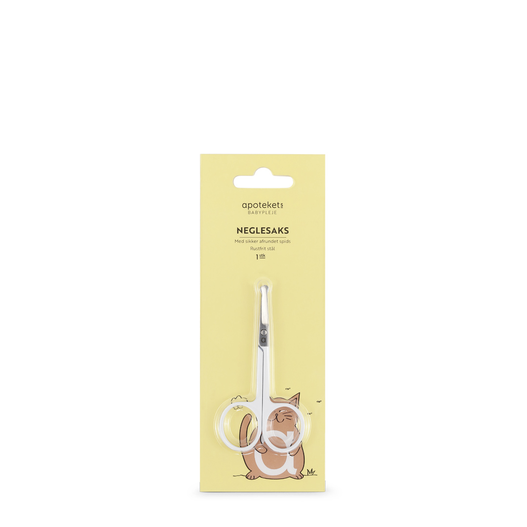 Neglesaks til klipning af spædbørns og småbørns finger- og tånegle. Den afrundede spids sikrer, at neglene kan klippes uden risiko for at beskadige barnets hud. Grebet er belagt med gummi, så saksen ligger sikkert i hånden.