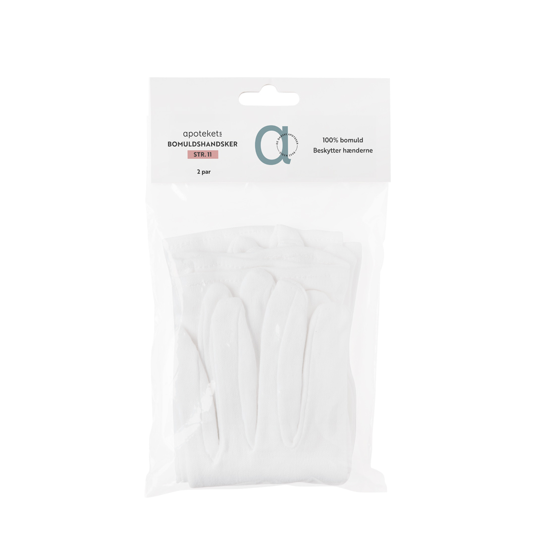 Apotekets Bomuldshandsker str. 11 er velegnede til beskyttelse af hænderne, f.eks. efter påføring af creme eller salve. Handskerne er fremstillet af hvid, tætstrikket 100% bomuld, og er fri for frøskaller.