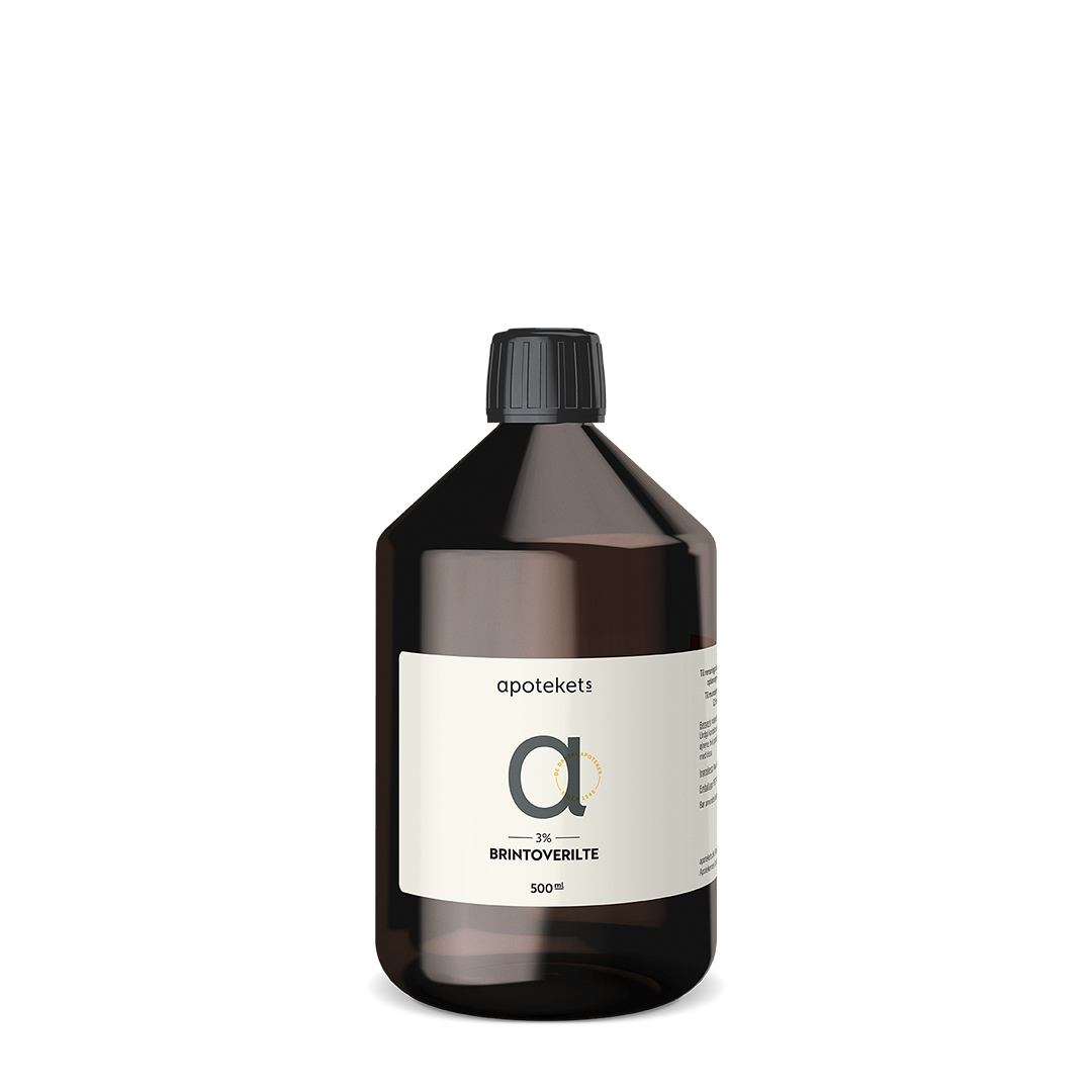 Apotekets Brintoverilte 3% kan anvendes til rensning af huden og til mundskylning.