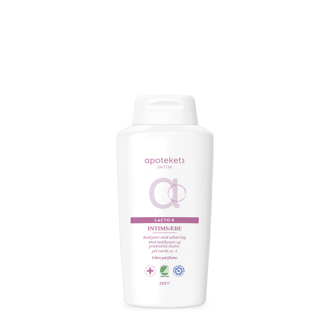 Apotekets Intimsæbe Lacto+ 250 ml rengør nænsomt med respekt for intimområdets naturlige balance. Apotekets Intimsæbe Lacto+ indeholder særligt udvalgte og milde vaskeaktiver og fugtgivende glycerin, som beskytter mod udtørring, mens mælkesyre og præbiotisk inulin bidrager til at styrke hudens barrierefunktion, gøre huden mere modstandsdygtig og bevare intimområdets naturlige balance.