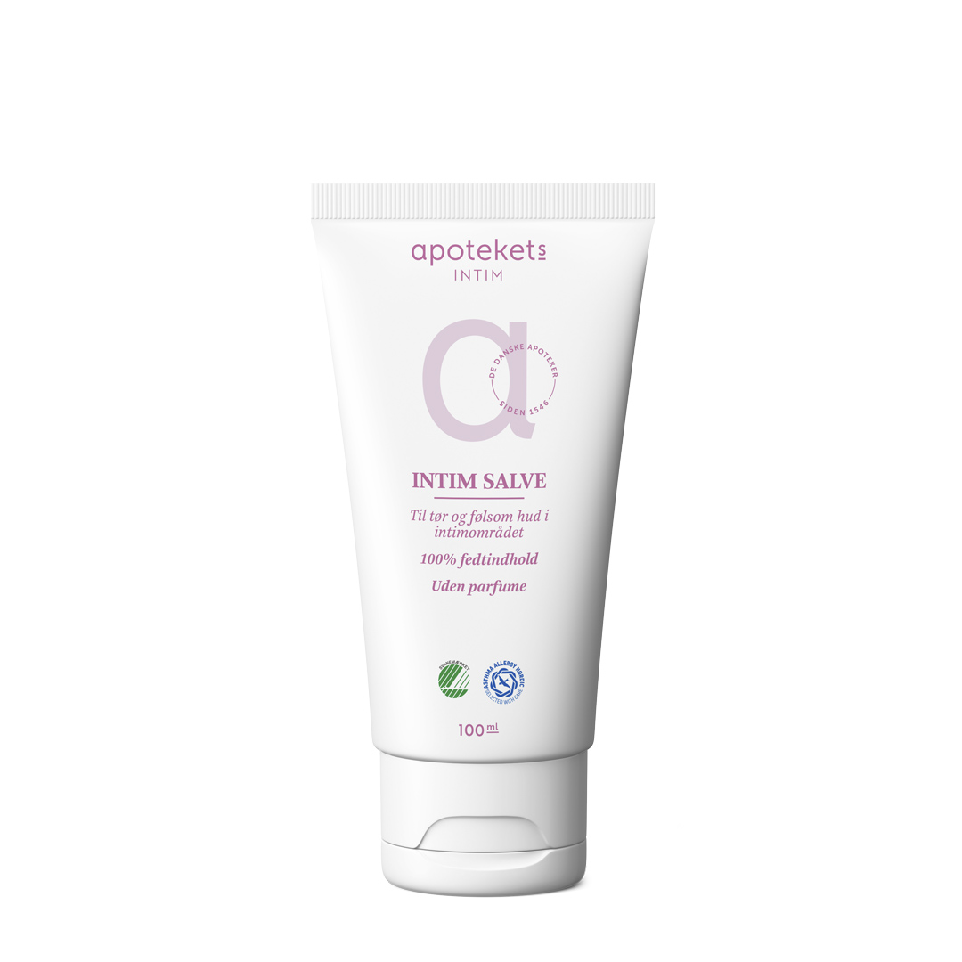 Apotekets Intimsalve er udviklet specielt til pleje af gener og skrøbelig, tør hud i intimområdet. Intimsalven mindsker irritation forbundet med tør hud omkring de ydre, kvindelige kønsorganer. Apotekets Intimsalve har et fedtindhold på 100%, den er vandafvisende og har både en beskyttende og en fugtighedsbevarende effekt.