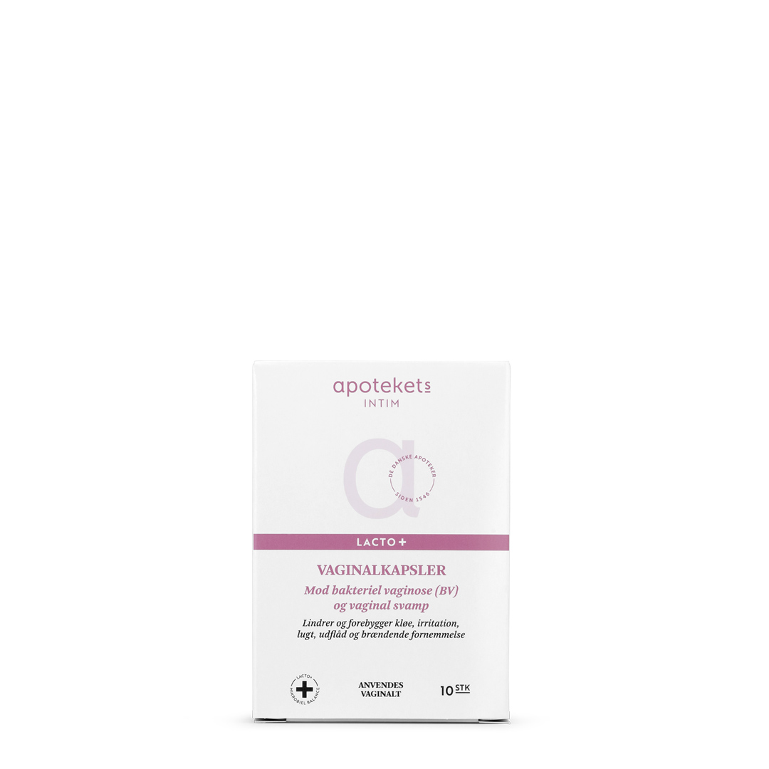 Apotekets Lacto+ Vaginalkapsler er et naturligt produkt baseret på et bioaktivt præbiotisk kompleks i kombination med vitaminer (C og E) samt hyaluronsyre. På grund af dets unikke sammensætning sænker og balancerer Apotekets Vaginalkapsler den vaginale pH-værdi til et fysiologisk niveau (<4,5). Dette niveau er afgørende for at beskytte mod uønskede bakterier og svampe.