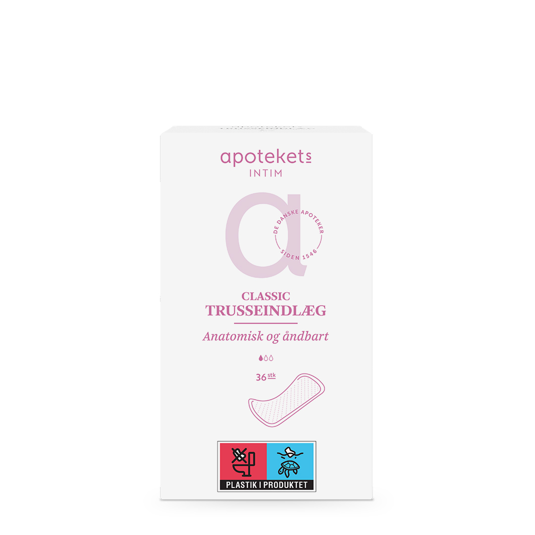 Apotekets Intim Trusseindlæg er et tyndt, blødt og anatomisk udformet trusseindlæg med en højabsorberende kerne, der sikrer mod gennemvædning. Trusseindlægget er fremstillet uden folie, så huden bedre kan ånde. Selvklæbende tape sørger for, at trusseindlægget bliver siddende, hvor det skal.