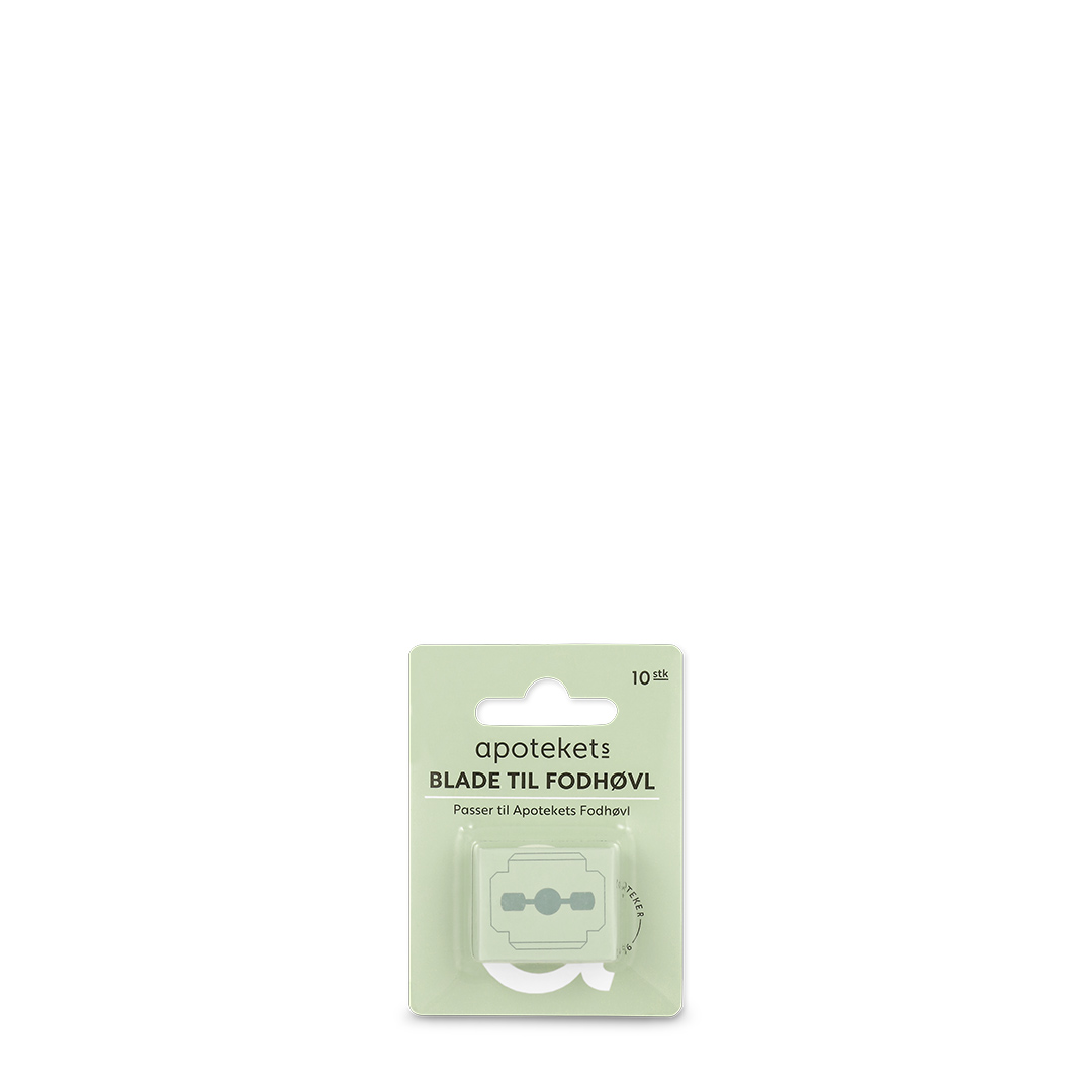 Passer til Apotekets Fodhøvl. Fjerner hård og død hud på hælene. Bladene er meget skarpe og bør kun anvendes til det yderste lag hård hud, for at undgå skader. Det anbefales at skifte bladet efter brug. Bør kun anvendes til Apotekets Fodhøvl.