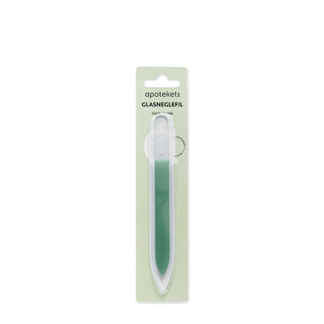 Apotekets Glasneglefil er en blid neglefil af specialhærdet glas. Den filer så fint og skånsomt, at den også kan bruges på lakerede negle. Glasneglefilen forsegler desuden neglekanten, så der er mindre risiko for spaltede negle.