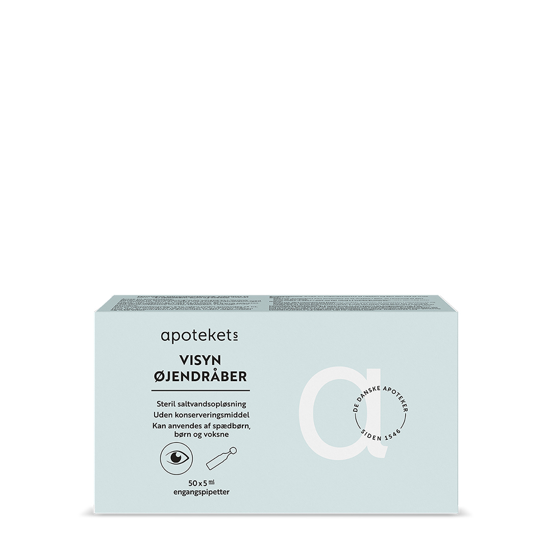 Apotekets Visyn øjendråber indeholder praktiske éngangspipetter med 5 ml sterilt saltvand. Apotekets Visyn øjendråber har samme saltkoncentration som tårer og er uden konserveringsmiddel.