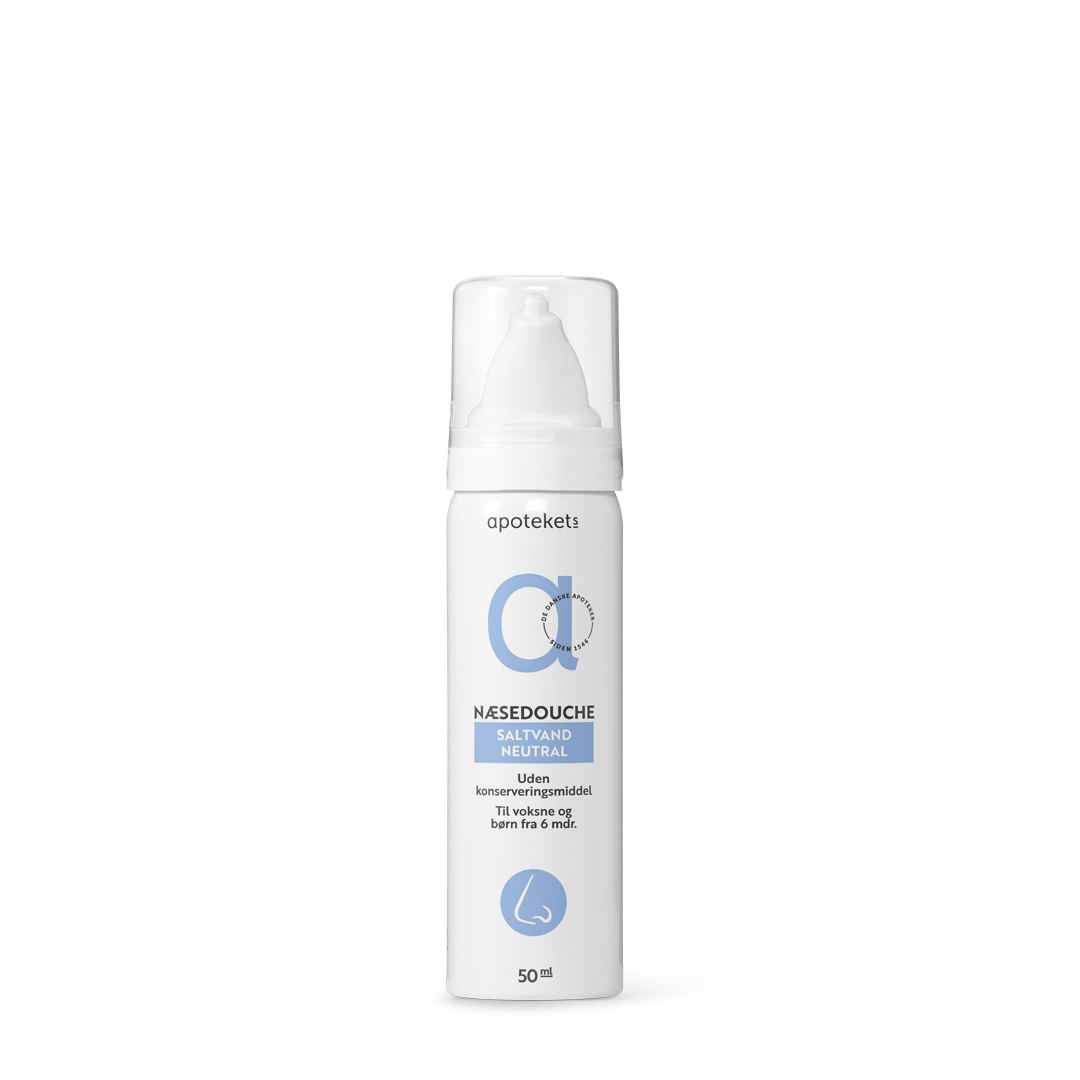 Apotekets Næsedouche Saltvand Neutral er en aerosol-spray der kan anvendes af voksne og børn over 6 måneder. Sprayen giver en fint forstøvet saltvandsopløsning, så længe studsen holdes nede.