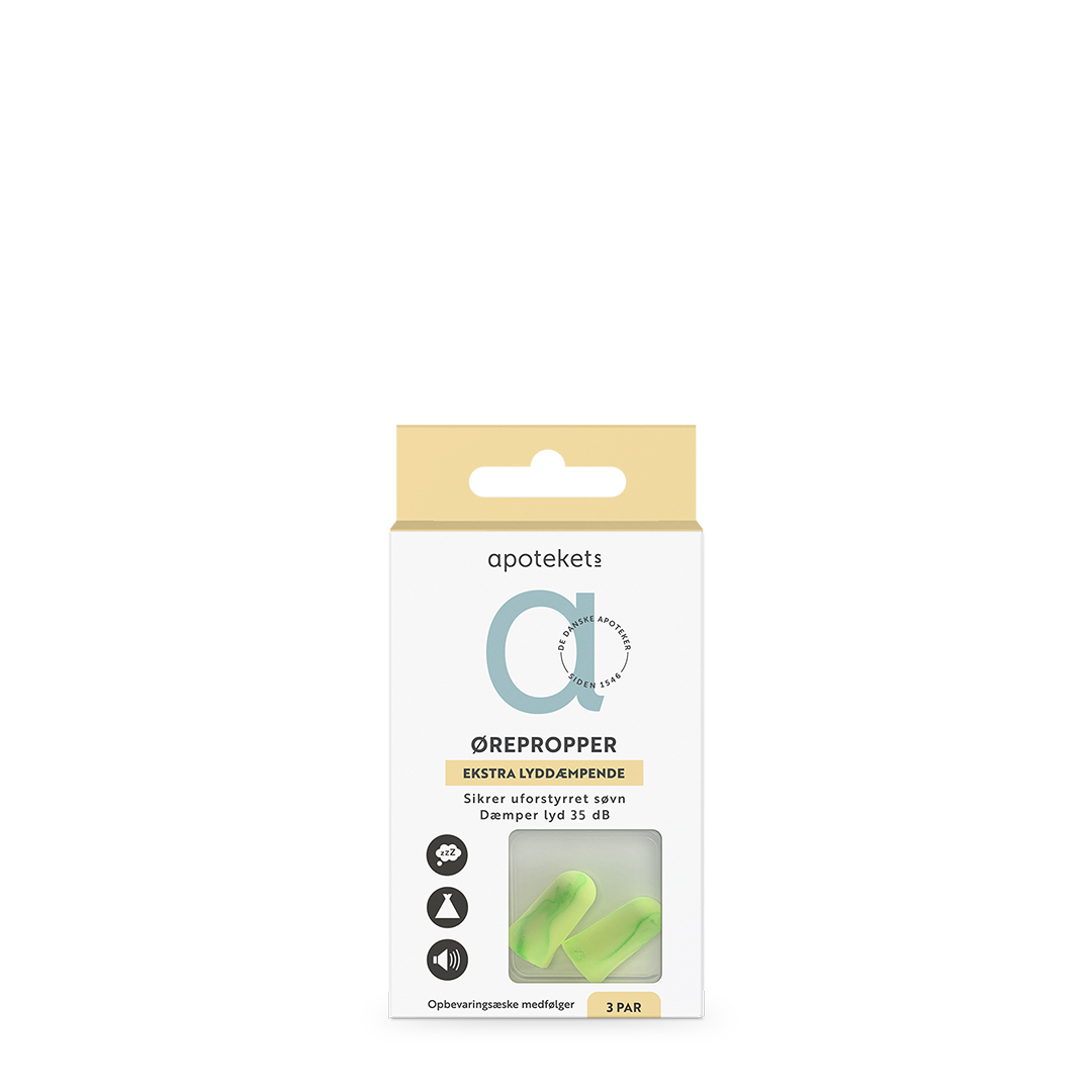 Apotekets Ørepropper, ekstra lyddæmpende beskytter effektivt mod høj støj. Ørepropperne dæmper lyd med 35 dB og er velegnede til at sikre ro og uforstyrret søvn hjemme eller på rejse.