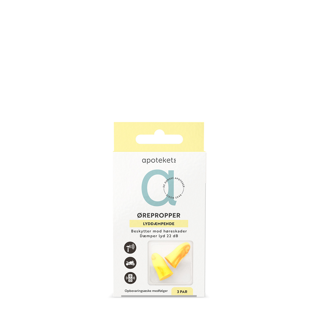 Apotekets Ørepropper, lyddæmpende beskytter mod høreskader. Ørepropperne dæmper lyd 22 dB. Omgivende lyde, f.eks. folk der taler, kan høres tydeligt, mens skadelige høje toner dæmpes. Apotekets lyddæmpende ørepropper beskytter hørelsen ved støjende gør det selv-arbejde eller havearbejde, koncerter, motorsport m.m.