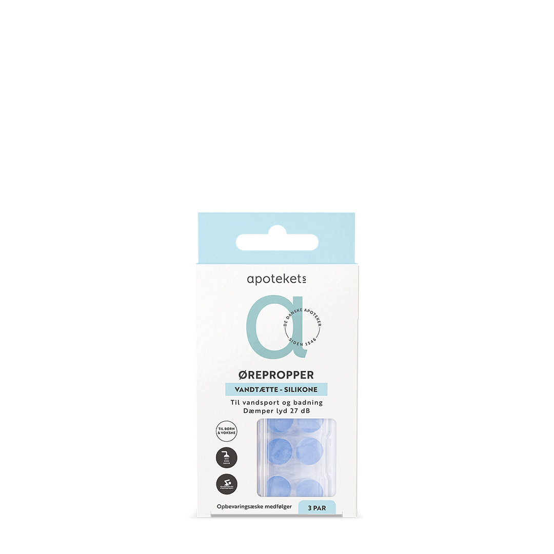 Apotekets Vandtætte Silikone Ørepropper til vandsport og badning beskytter mod indtrængen af vand i øret. Ørepropperne er lavet af blød, formbar silikone og kan anvendes til både voksne og børn. Apotekets vandtætte silikoneørepropper er også velegnede til børn med dræn i øret. Ørepropperne placeres i det ydre øre for at undgå vand i øregangen ved karbad, brusebad, hårvask, svømning og badning.