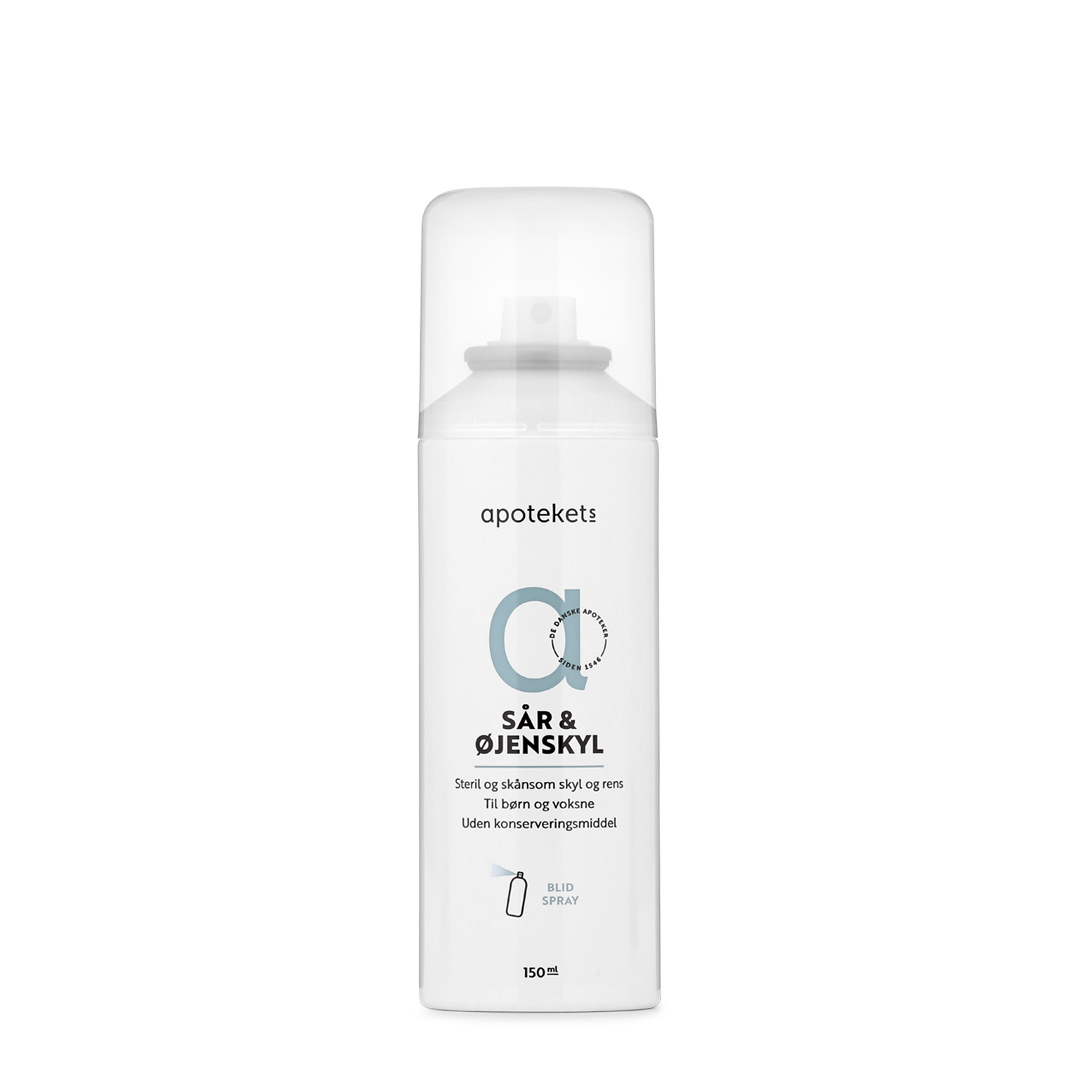 Apotekets Sår- & Øjenskyl er en steril, isotonisk saltvandsopløsning (0,9 % NaCl) til skånsom rensning og skylning af både sår og øjne hos børn og voksne. Den særlige spraydyse forstøver saltvandet ekstra fint og renser derfor blidt og effektivt uden at berøre det følsomme område.