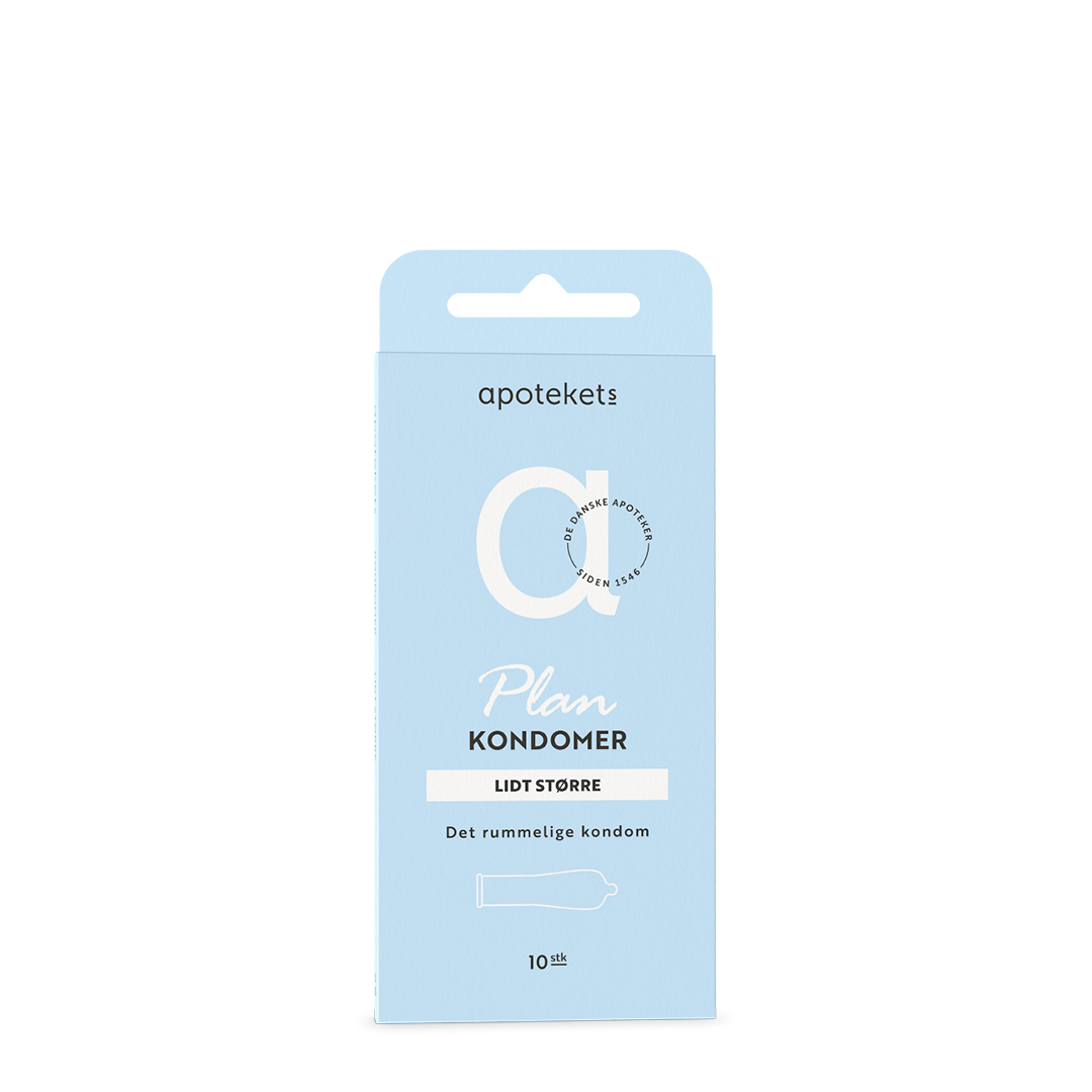 Apotekets Plan - Lidt større er et kondom, der er ekstra stort, stærkt og rummeligt i toppen. Kondomet har reservoir, er cremebehandlet udvendigt og pudret indvendigt med majsstivelse for at forhindre, at det glider af under samlejet.