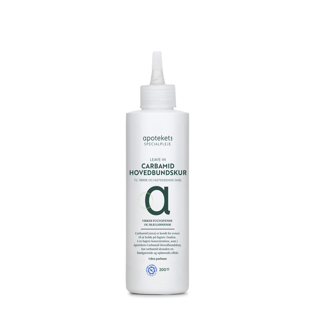 Apotekets Carbamid Hovedbundskur indeholder carbamid og "Hairflux". Carbamid er en velkendt, aktiv ingrediens til særligt plejekrævende hud. Carbamid tilfører nødvendig fugt til huden i hovedbunden og har keratolytisk effekt, så skællene løsnes og let kan fjernes. ”Hairflux”, som består af planteolier og ceramider, afhjælper gener forårsaget af tør og irriteret hovedbund.