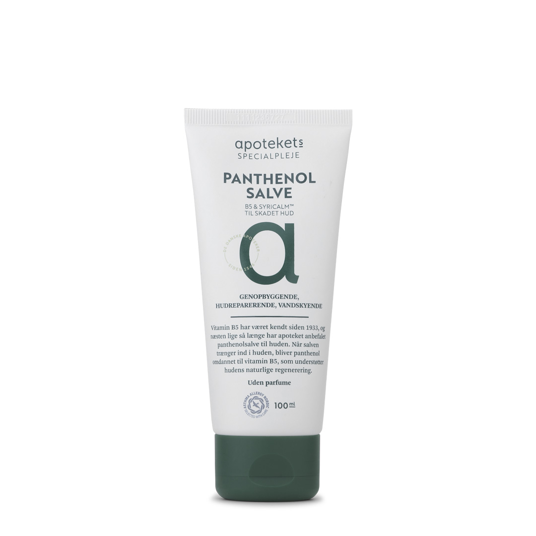 Apotekets Specialpleje Panthenolsalve er en vandskyende salve til pleje og beskyttelse af overbelastet og skadet hud. Salven mindsker kløe og irritation i huden, og er velegnet til pleje af friske tatoveringer, tørre og ru hudområder, solskadet hud, revner i mundvigene, hudafskrabninger m.m.