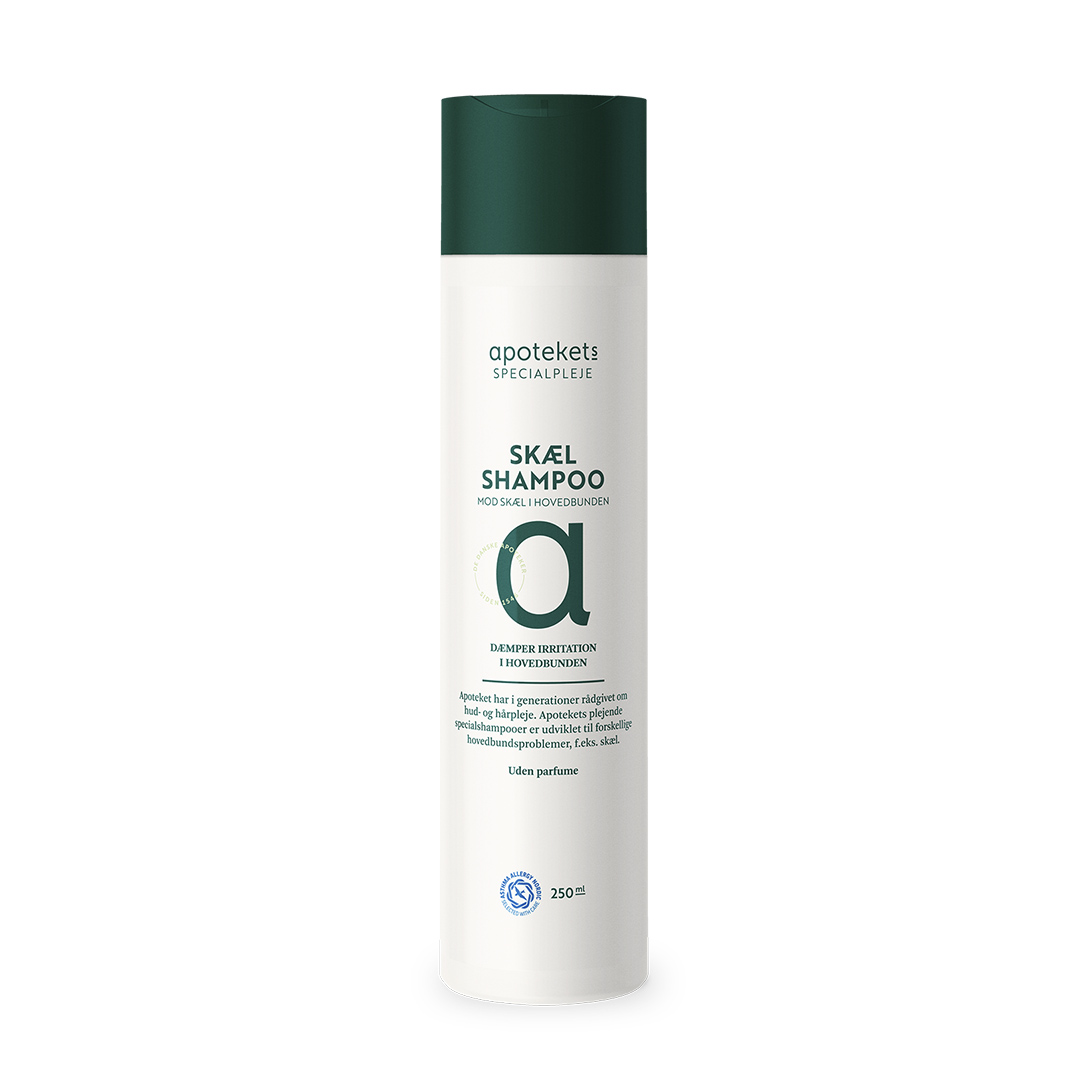 Apotekets Specialpleje Skælshampoo er en parfumefri og allergideklareret specialshampoo til effektiv behandling og forebyggelse af skæl i hovedbunden.