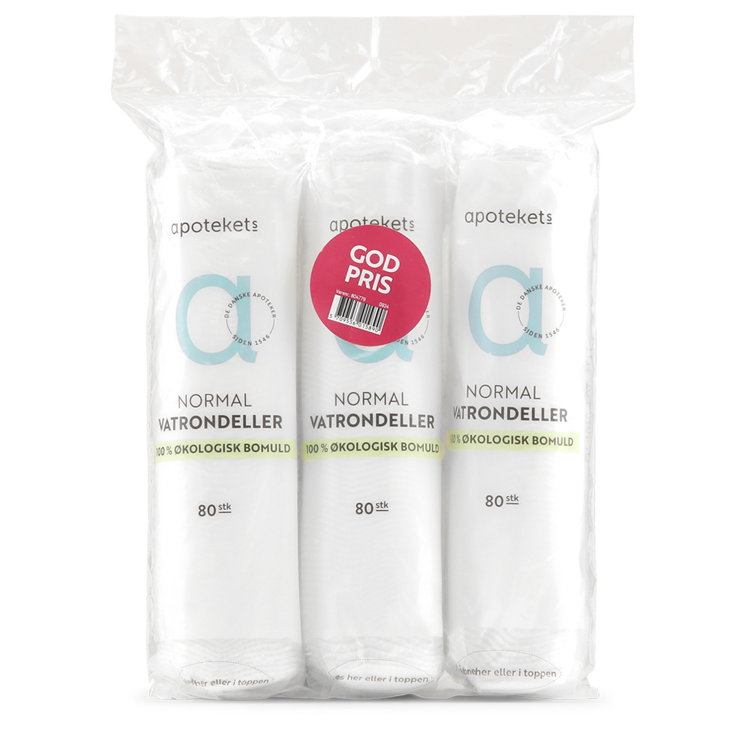 Apotekets Vatrondeller er fremstillet af 100% økologisk bomuld. Vatrondellerne har blød, forseglet kant, så de hverken fnugger eller deler sig.
