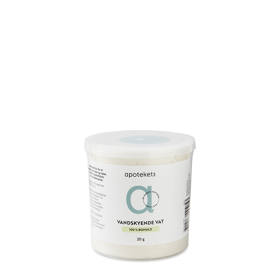 Apotekets Vandskyende Vat består af 100% kæmmet, ren, ubleget bomuld uden blegemidler eller parfume og er biologisk nedbrydeligt.