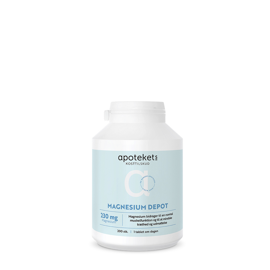 Magnesium er et mineral med betydning for blandt andet knoglernes, musklernes og nervesystemets normale funktion. Det er muligt at supplere maden med et kosttilskud. Apotekets Magnesium er en depottablet, der frigiver mineralet lidt ad gangen for at holde et stabilt niveau af magnesium i tarmen.