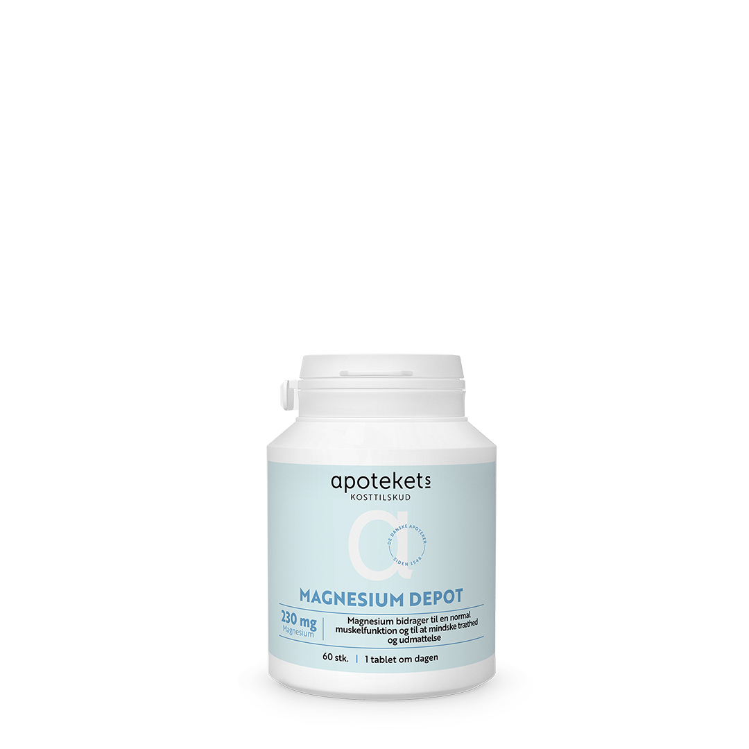 Magnesium er et mineral med betydning for blandt andet knoglernes, musklernes og nervesystemets normale funktion. Det er muligt at supplere maden med et kosttilskud. Apotekets Magnesium er en depottablet, der frigiver mineralet lidt ad gangen for at holde et stabilt niveau af magnesium i tarmen.